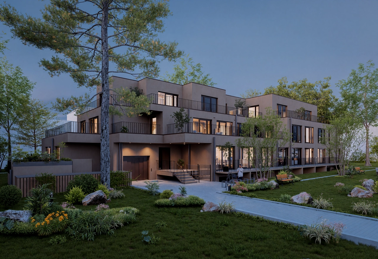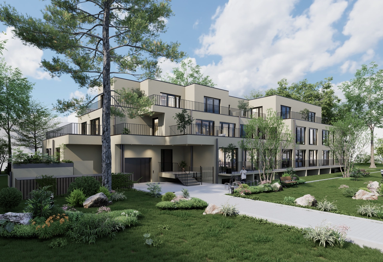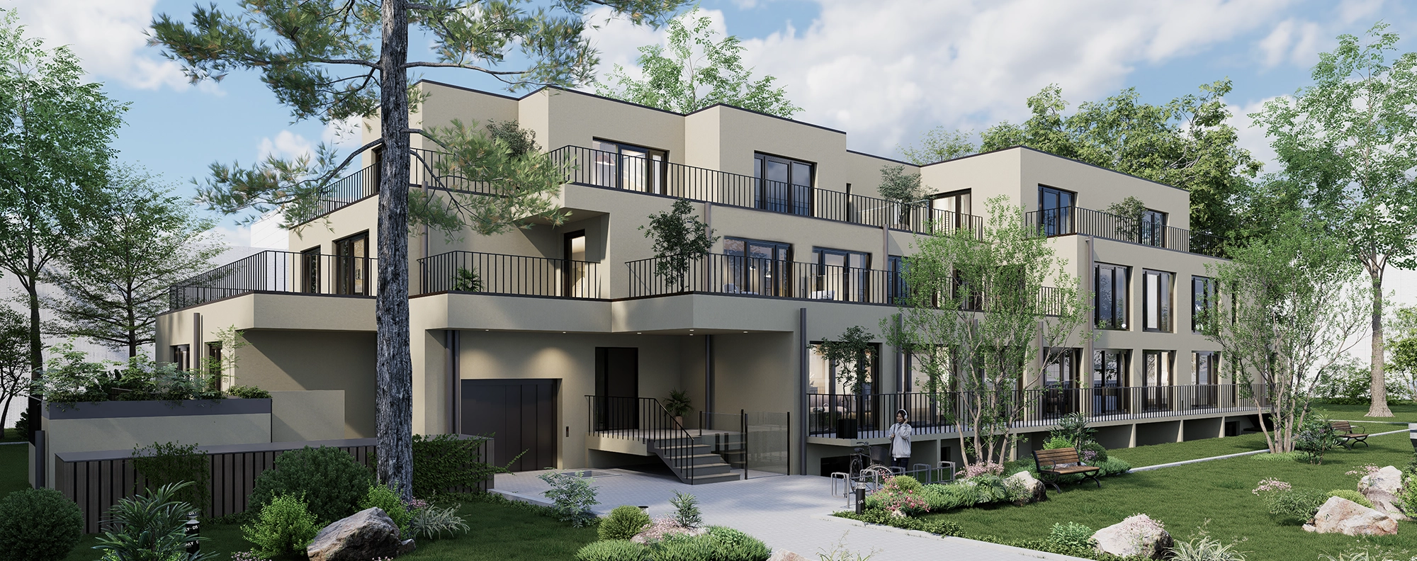 Jede Wohneinheit verfügt über eine Terrasse mit Garten, eine großzügige Dachterrasse oder einen Balkon. Eine Tiefgarage mit einem Stellplatz pro Wohnung rundet das Angebot ab. Das Gebäude fügt sich harmonisch in die Umgebung ein und bleibt dennoch ein echter Hingucker.